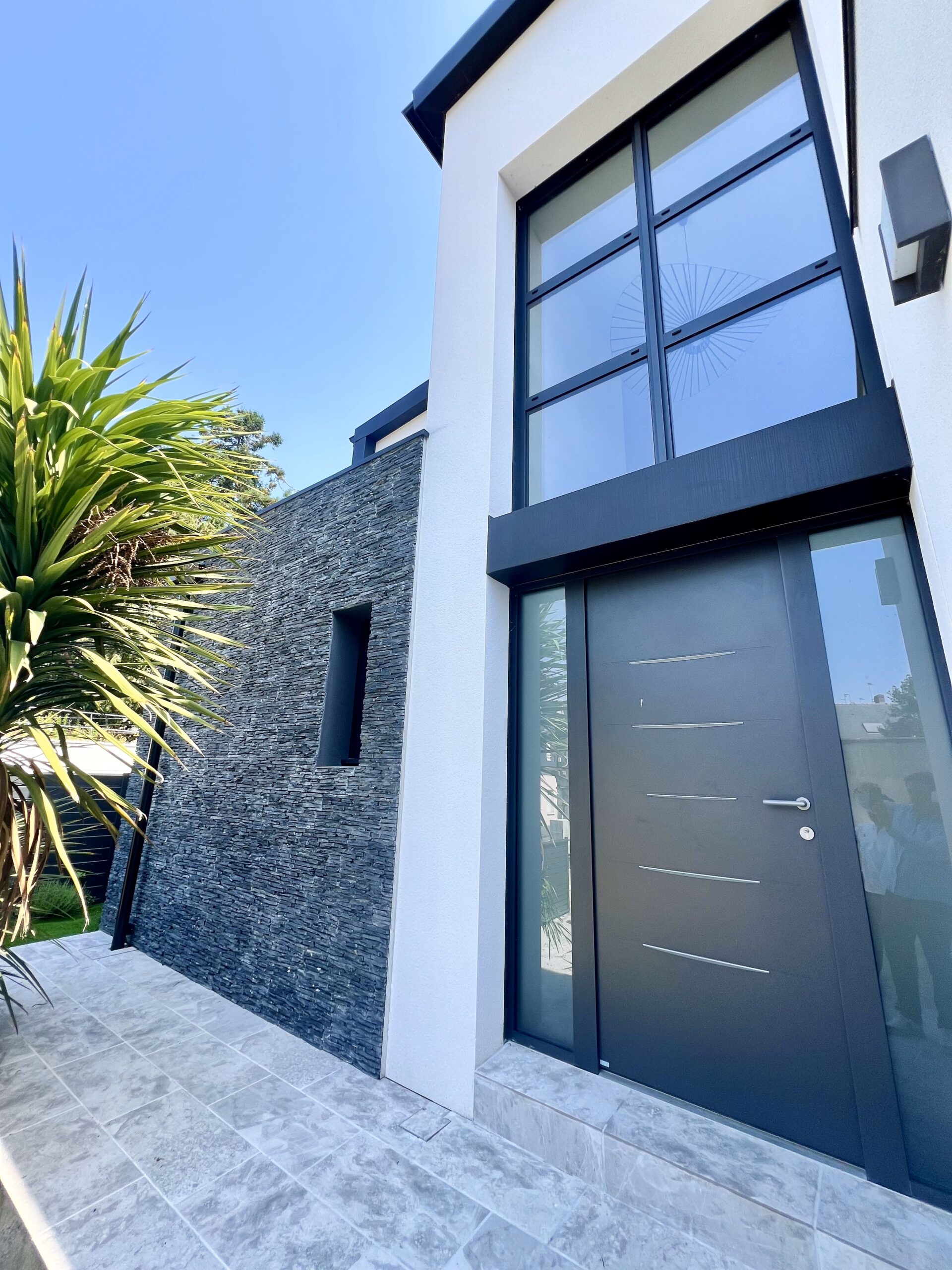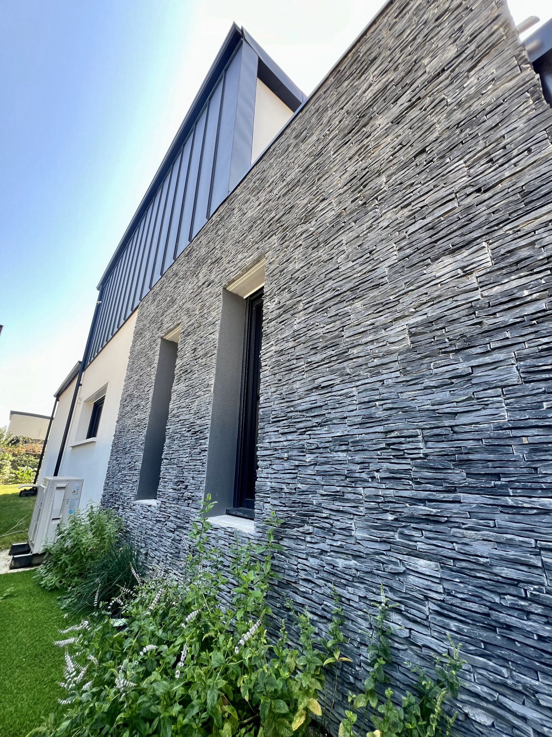 Ce projet se distingue par ses beaux volumes, son parement en ardoise naturelle et ses grandes ouvertures qui apportent une luminosité exceptionnelle à l’espace de vie.